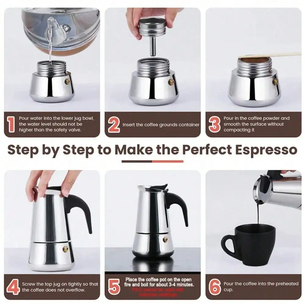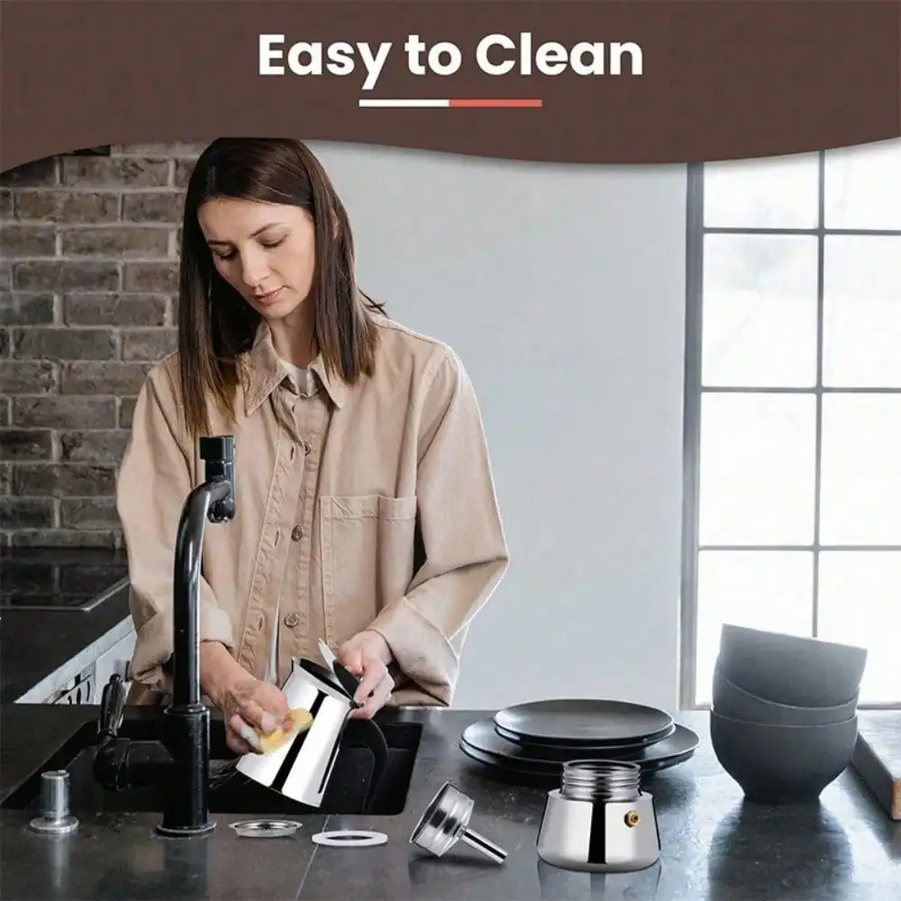 This 12-cup stainless steel moka pot espresso maker delivers rich, full-bodied coffee with a classic stovetop brewing method. With a 600ML capacity, it’s perfect for serving multiple cups at home, in the kitchen, or while camping. Made from durable stainless steel, it ensures long-lasting performance and even heat distribution for consistent results. Easy to use and clean, this coffee pot is ideal for coffee lovers who enjoy traditional espresso-style brewing with convenience and reliability.